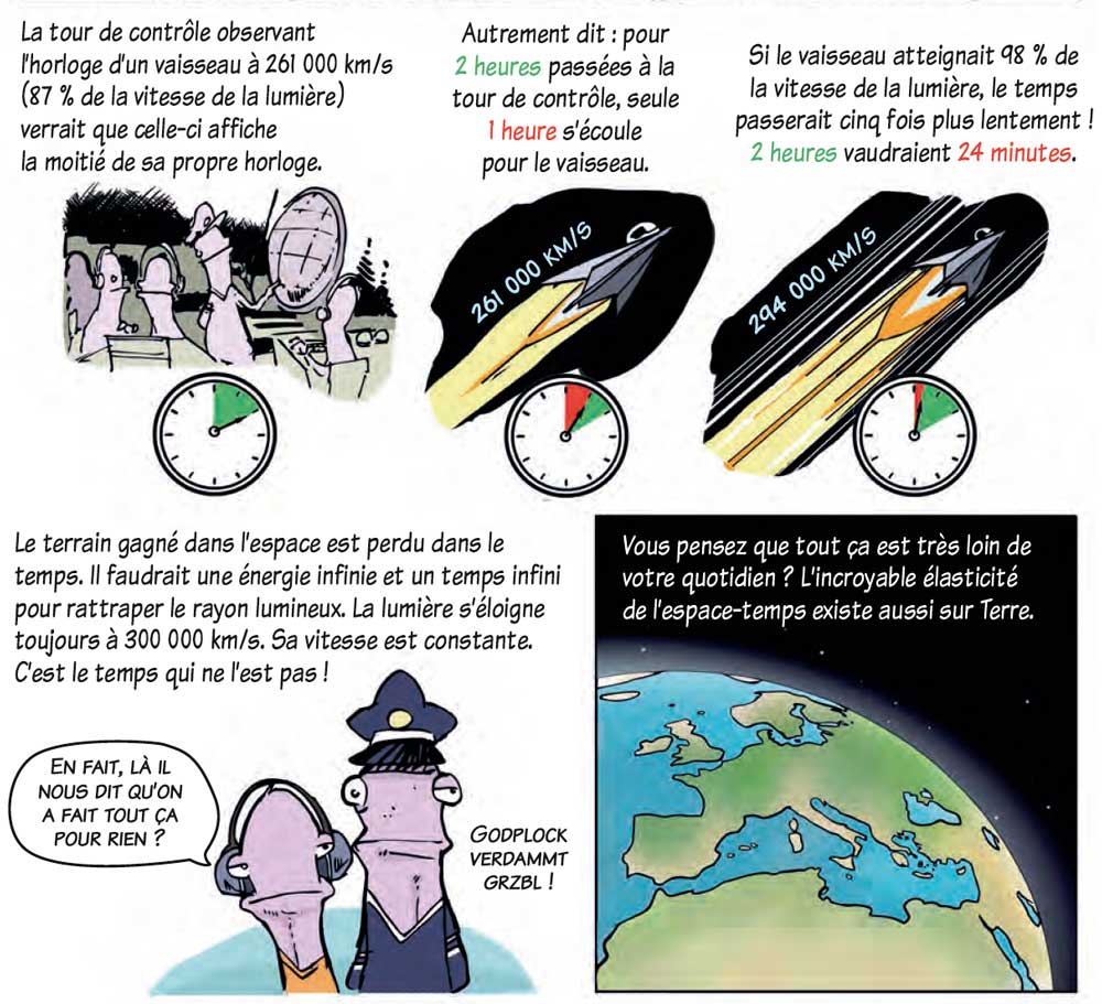 J’ai trouvé cette BD vraiment géniale : agréable à lire, de beaux dessins et un ton humoristique ! Cet ouvrage explique à l’aide d’exemples simples des sujets très complexes telles que la relativité ou la physique quantique. Ce qui permet au lecteur amateur de s’immerger dans les domaines abordés est également l’histoire servant de support, un fil conducteur concernant une petite famille sympathique, dans sa vie de tous les jours (les vacances au ski, la course à pied, …) mais également des exemples liés à des anecdotes très parlantes (le pécheur qui approche un vortex qui symbolise le trou noir). Il faut quand même, je pense, un minimum de background scolaire voire scientifique pour vraiment bien comprendre certaines problématiques abordées mais cela n’empêche pas le profane de bien s’approprier des notions qui pouvaient lui paraître obscures de prime abord (qu’est-ce qu’un atome, l’énergie et la masse sont liées…)